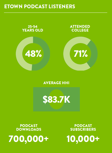 eTown is an exciting weekly radio broadcast heard from coast to coast. Every eTown show is taped in front of a live audience and features performances from many of today’s top musical artists as well as conversations and information about the world around us.